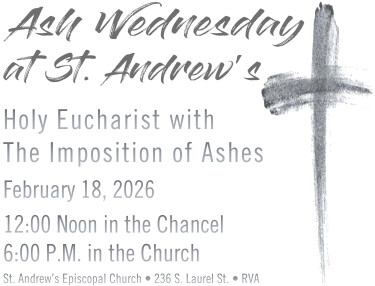 We'll mark the beginning of Lent on Ash Wednesday, February 18, with Holy Eucharist Rite II and the Imposition of Ashes at Noon in the chancel and 6:00 p.m. in the church.